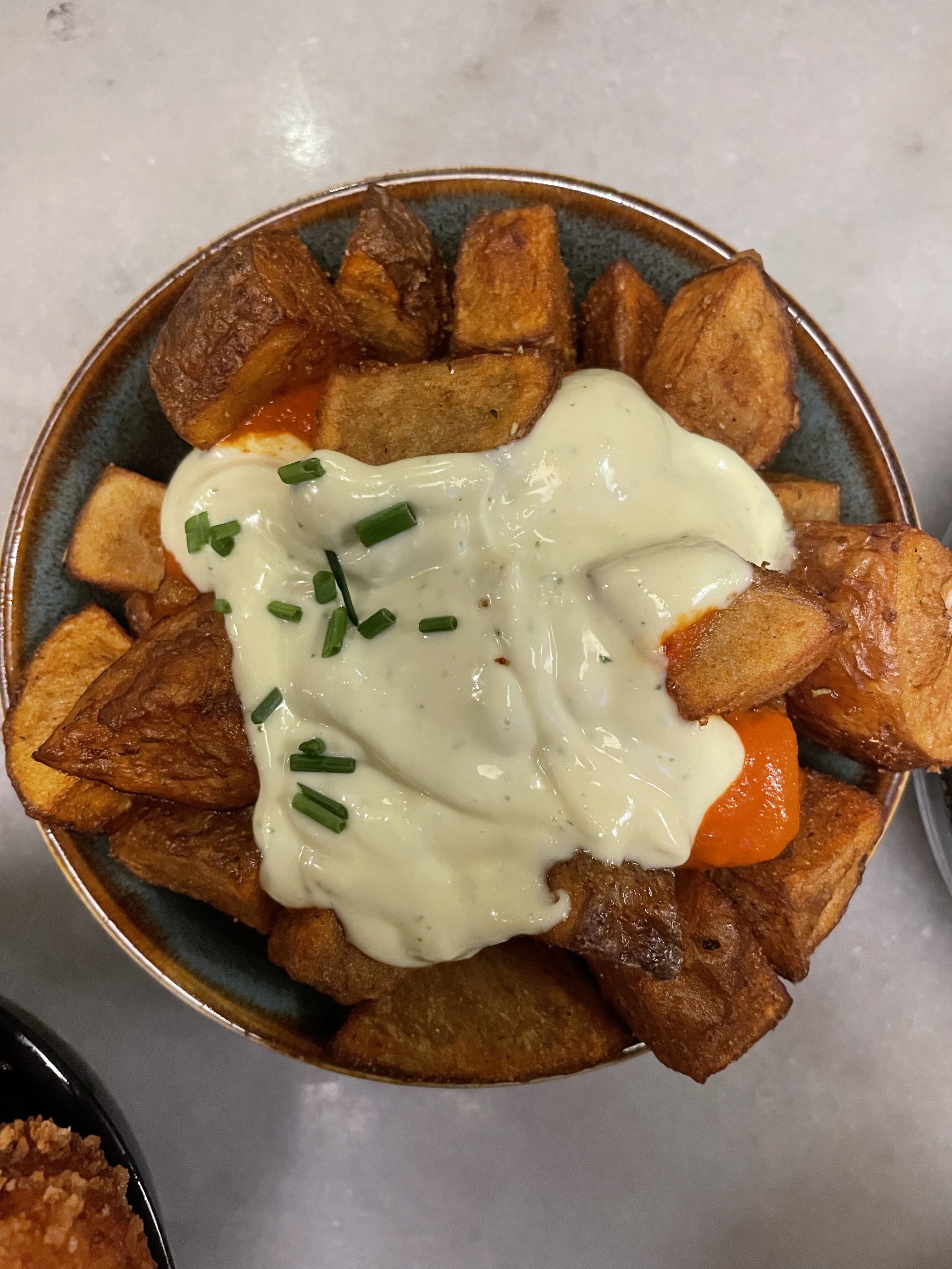 Nous avons eu une expérience fabuleuse ici et c'était l'un de mes repas préférés/mémorables en Europe !! Ils vous accueillent d'abord avec un shot et tous les serveurs étaient merveilleux. Nous étions assis en bas, ce qui était chaud mais ok. Nous avons commandé des tonnes de plats et tous étaient merveilleux. C'est ce que nous avons commandé... Les tapas du moment, qui étaient du porc, des pommes de terre, des champignons (merveilleux), la burrata de tomates en grappe rôties, du pesto (délicieux), du Cabillaud (bon), du Poulet croustillant aux cacahuètes (très bon), Saumon sur riz (ok mais mes amis ont adoré - le riz avec était incroyable), pommes de terre courageuses (les meilleures), poivrons farcis (deuxième meilleur), jambon (délicieux) et fromage (merveilleux). Nous avons eu un repas fabuleux et nous ne pouvions pas en recommander davantage ! De plus, les boissons étaient également délicieuses !