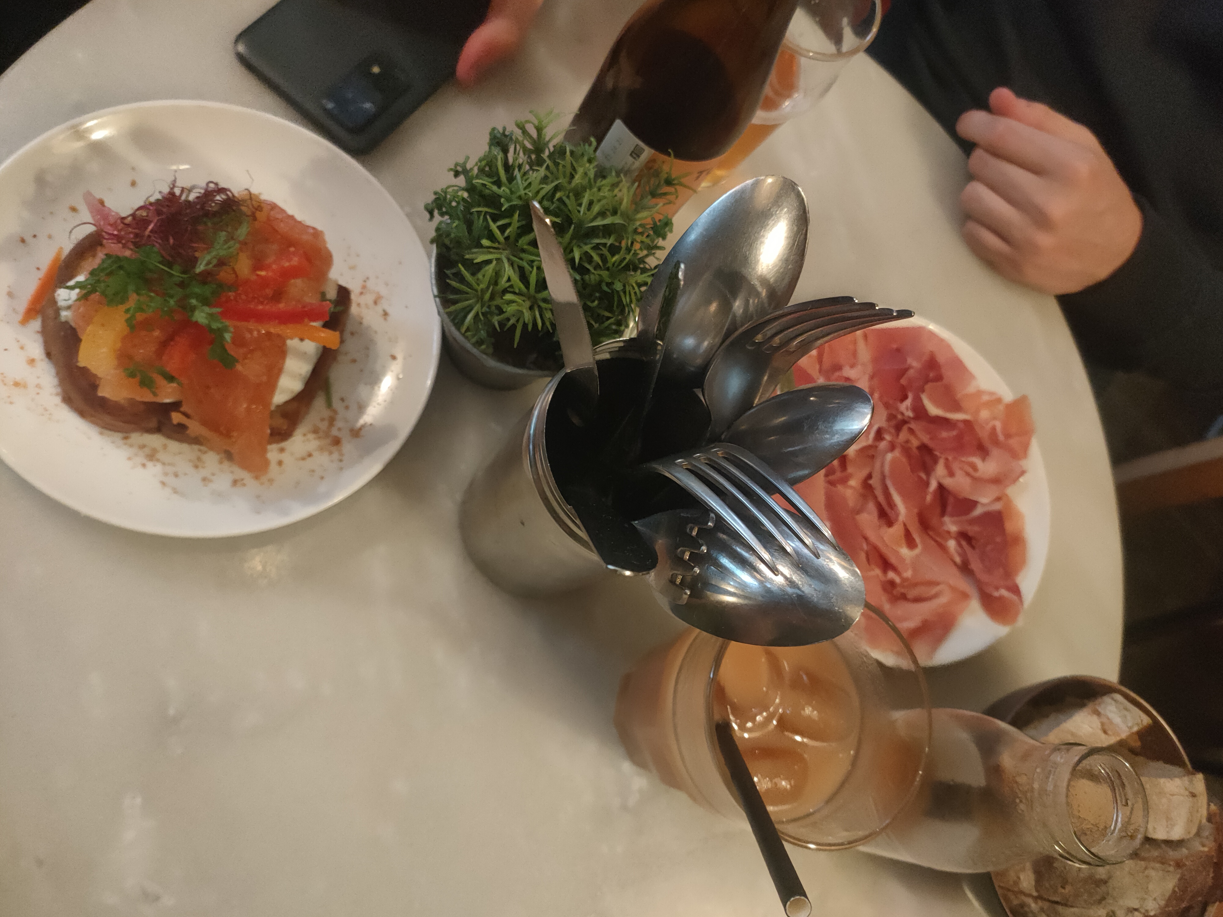 Surprise : dans ce restaurant à la décoration soignée, aucun respect des mesures basiques liées au Covid (sauf le masque) : les couverts sont dans des pots en plein milieu de la table, non changés entre 2 passages ; si votre prédécesseur a postillonné dedans, vous dégustez ses gouttelettes. Les tables sont collées le plus possible, le mètre de distance n'est nulle part respecté ; des réservations qui arrivent de plus de 10 personnes ... Le personnel est désagréable (probablement car débordé), ce qui gâche l'expérience. Nous nous sommes fait littéralement virer après 2H de consommation, le dessert à peine fini. Dommage, car les tapas sont délicieux.